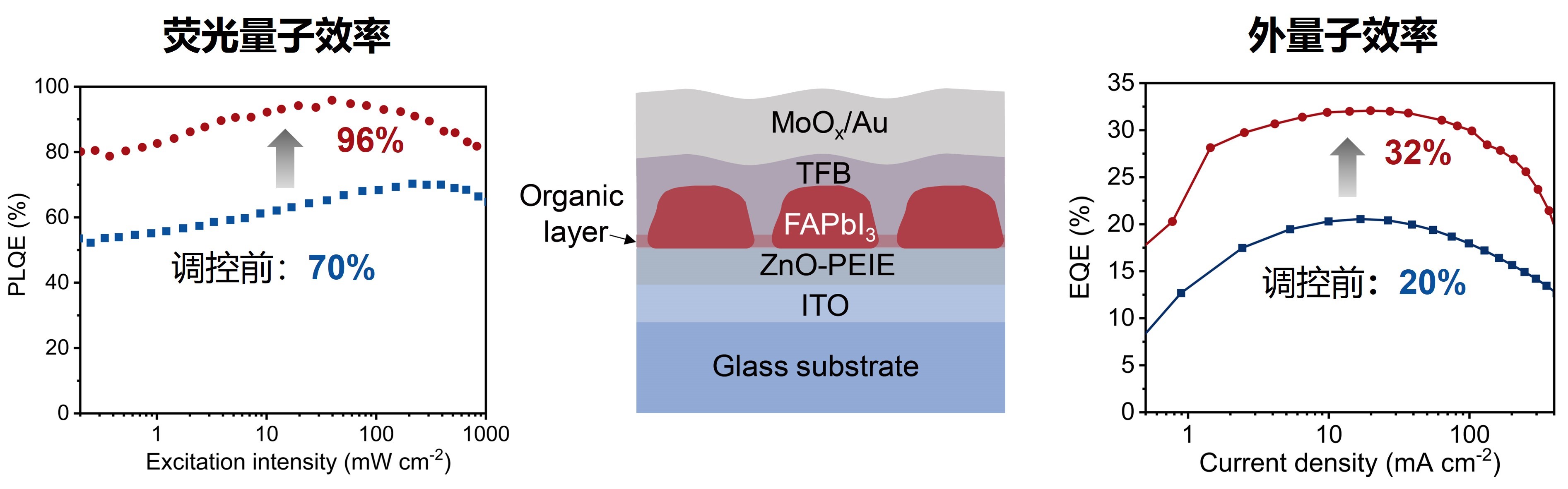 為解決這一難題,該團隊另辟蹊徑,創造性地提出了一種通過調控晶體生長的方法,生成輻射復合速率更快的鈣鈦礦晶相,從而顯著提高了熒光量子效率。同時,團隊巧妙地運用這一創新性方法成功地保持了三維鈣鈦礦的亞微米結構,使器件的光提取效率不受影響,達到了雙管齊下的效果。該研究由此實現了96%的熒光量子效率和大于30%的光提取效率,并進一步制備出外量子效率達到32%的高效鈣鈦礦LED,再次創造了鈣鈦礦LED發光效率的世界紀錄。