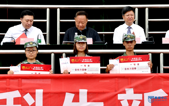 開學(xué)典禮上,芮鴻巖書記宣讀了《關(guān)于表彰2017年“啟明星”計劃“新生雛鷹獎學(xué)金”獲獎學(xué)生的決定》,陳梅旭等127名新生分別獲得一、二、三等獎和體育貢獻(xiàn)獎,校領(lǐng)導(dǎo)為獲獎代表頒獎。