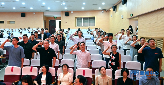 新進教師代表在校第七屆“師德楷模”、化工學院馮新老師的帶領下進行了莊嚴的入職宣誓。圖書館趙乃瑄老師、環境科學與工程學院仲兆祥老師、應急管理學院馬海韻老師、化工學院徐樂老師、城市建設學院張淑娟老師作為教師代表交流發言。