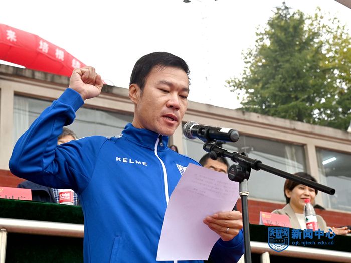江蘇省第二十屆運動會女子800米、3000米障礙賽兩枚金牌獲得者、經濟與管理學院工商2106班陳慧婷同學和國際級裁判、體育學院解鑫老師分別代表全體運動員和裁判員宣誓。