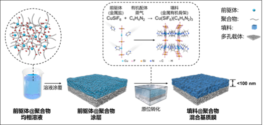 相比傳統分離技術,膜分離具有能耗低和環境友好等優勢。將高性能無機填料摻雜在聚合物中制備混合基質膜,有望突破膜滲透性和選擇性的制約關系,成為近年來國際研究前沿。然而,混合基質膜仍未大規模應用,面臨填料團聚和界面缺陷的重大挑戰,如何制備超薄超高摻雜的無缺陷混合基質膜是學術界和產業界一直以來追求的夢想。金萬勤教授團隊是國際上較早開展混合基質膜研究的團隊之一,基于持續多年的研究積累以及對關鍵科學問題的深入理解,他們跳出傳統思維模式,提出“固態溶劑法”制備混合基質膜(圖1)。區別于傳統的“合成填料—分散填料—填料與聚合物混合”制備混合基質膜的復雜工藝,該方法僅需在聚合物中溶解高含量前驅體而后通過原位轉化即可實現高含量填料的均勻超薄化摻雜,同時構造了以填料為主體相的新型混合基質膜結構,填料之間形成的貫穿孔道為分子提供超快傳輸通道。