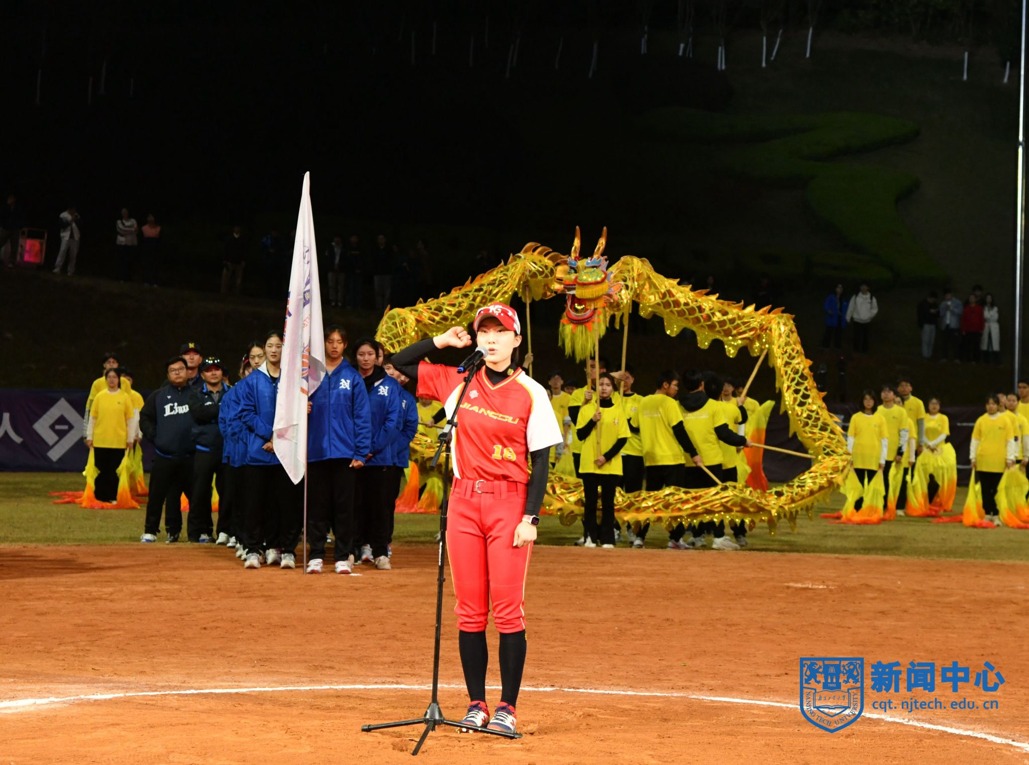 我校江蘇女壘隊員桑于娟和壘球國際級裁判于志玲分別代表運動員和裁判員宣誓。