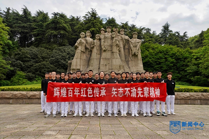 蒼松翠柏環繞的烈士群雕廣場莊嚴肅穆,全體參加人員滿懷深情面向烈士群雕默哀致敬,并逐一獻上代表誠摯心意的菊花,感恩逝去的英烈。隨后全體師生在烈士群雕下誦讀了師生共同創作的詩歌《雨花臺祭英烈》。四位師生領誦者將人們的思緒拉回那個紅色的年代,八位教師代表深切緬懷那些用鮮血和意志譜寫的偉大篇章,全體師生集體向為自由真理、民族復興、人類和平而犧牲的英雄們致敬、禮贊。鏗鏘有力、莊嚴堅定的聲音響徹廣場,整齊劃一、精神飽滿的誦讀者更是引來眾多園區參觀者駐足欣賞、拍照留影。參加拍攝活動的師生一致表示,這是一場極其生動的黨史學習教育,也是一次愛國主義精神的洗禮,無數仁人志士拋頭顱、灑熱血,他們崢嶸的歲月將永遠鼓舞世人,他們堅毅的精神將始終照亮后輩前進的道路。