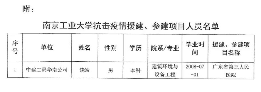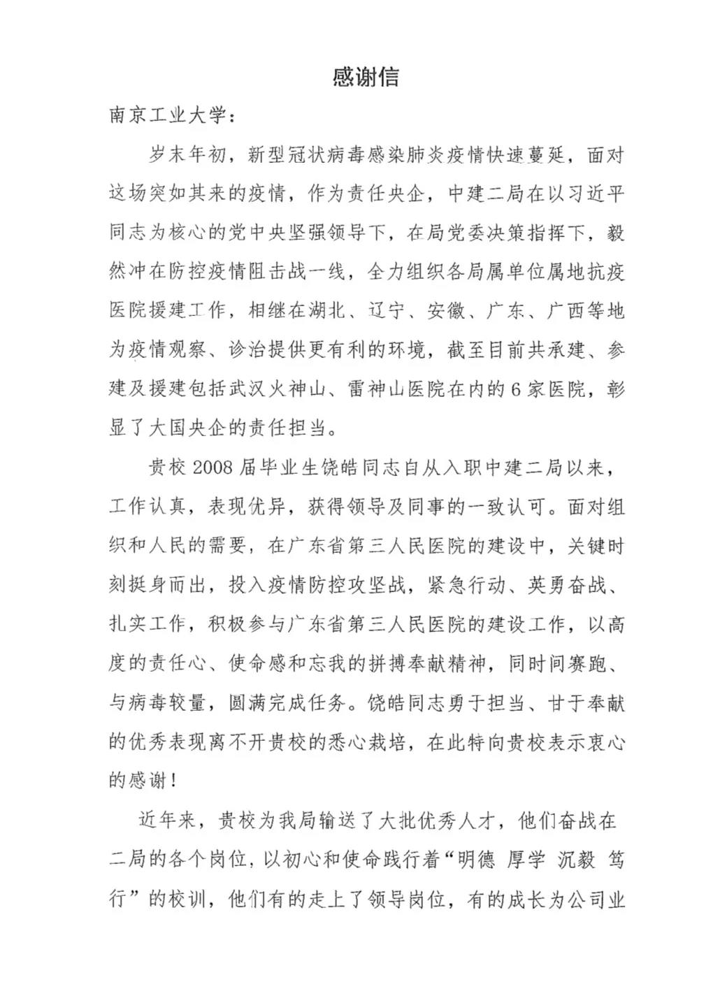 饒皓校友平時工作認真,表現優異,獲得領導及同事的一致認可。在抗擊新冠肺炎疫情的關鍵時刻,他挺身而出,積極參與廣東省第三人民醫院的建設,以高度的責任心、使命感和忘我的拼搏奉獻精神,圓滿完成任務。日前,中建二局向我校發來感謝信。