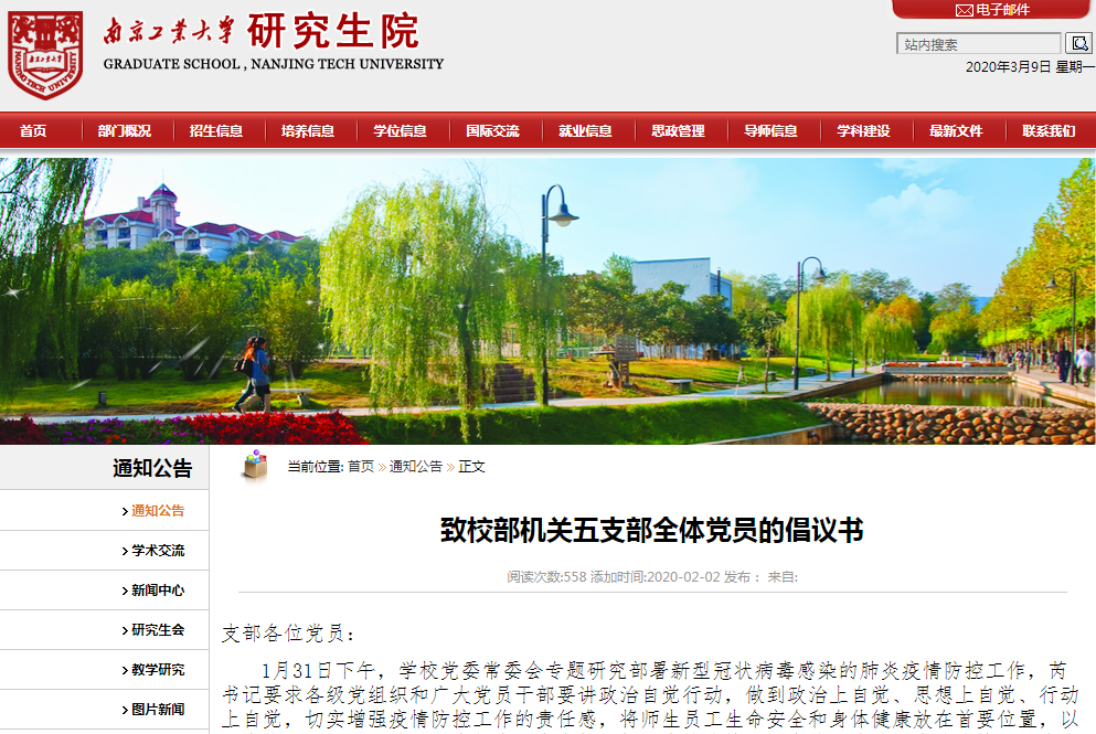2月1日,研究生院發出“致校部機關五支部全體黨員的倡議書”,對研究生院全體黨員發出了“戰前集結令”,充分發揮黨支部戰斗堡壘作用。