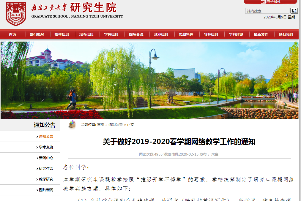 到目前為止,研究生院已制定和正在實施“2020年春季學期延期開學的研究生教學工作方案”。先后發布了“關于2020年春季學期研究生相關工作的通知”、“關于2020 年春季學期疫情防控期間研究生相關工作的通知”、“關于做好2019-2020春學期網絡教學工作的通知”、“關于2020年上半年全國大學英語四六級考試預報名通知”、“關于疫情期間研究生在線教學情況實時統計的通知”、“關于調整2020年我校申請國家公派出國留學項目相關工作安排的通知”、“關于做好研究生在線教學工作階段性總結的通知”、“關于做好疫情期間南京工業大學研究生線上課程學生評教的通知”等相關通知。