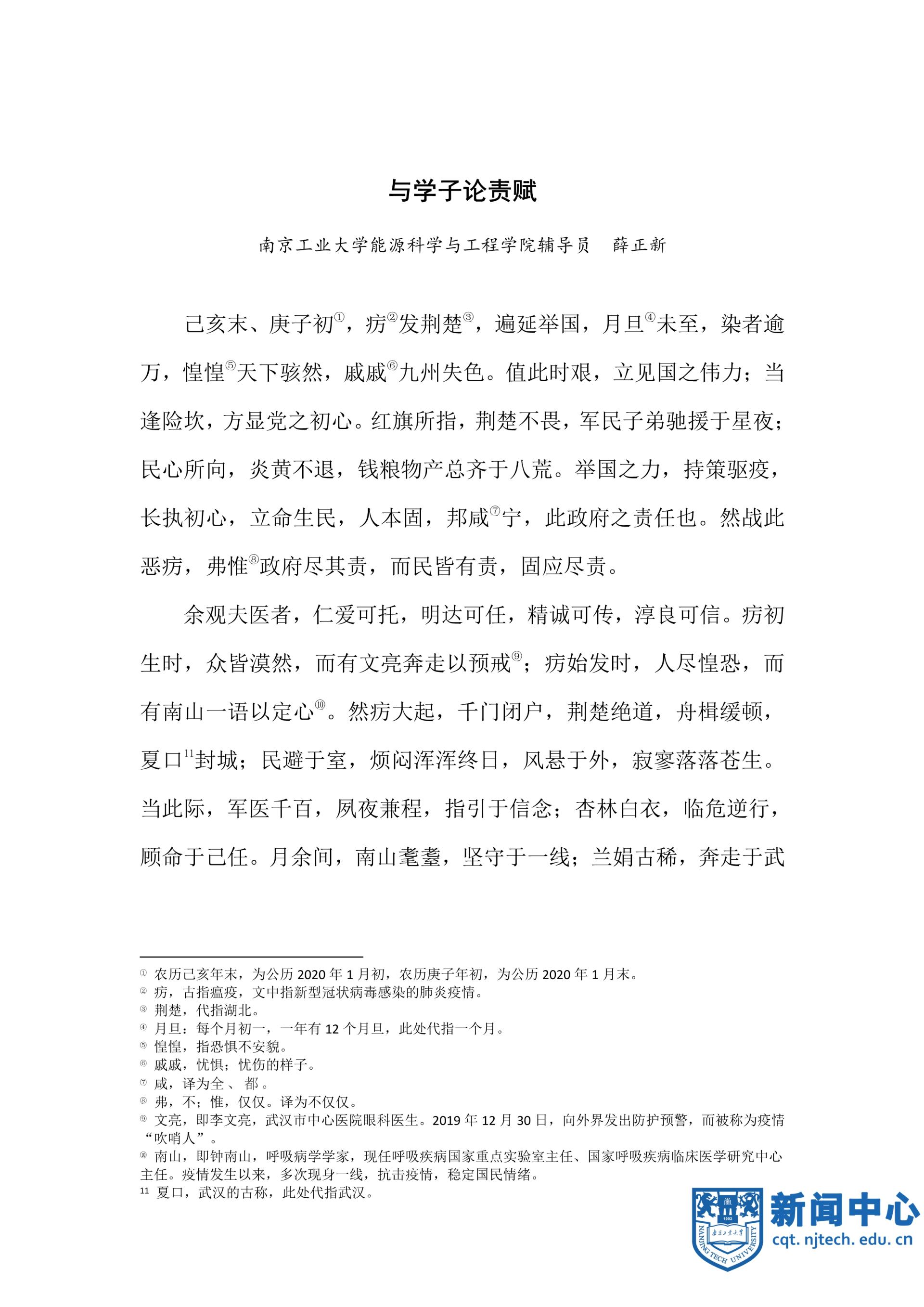 戰“疫”暖心事┃輔導員薛正新創作文言文《與學子論責賦》