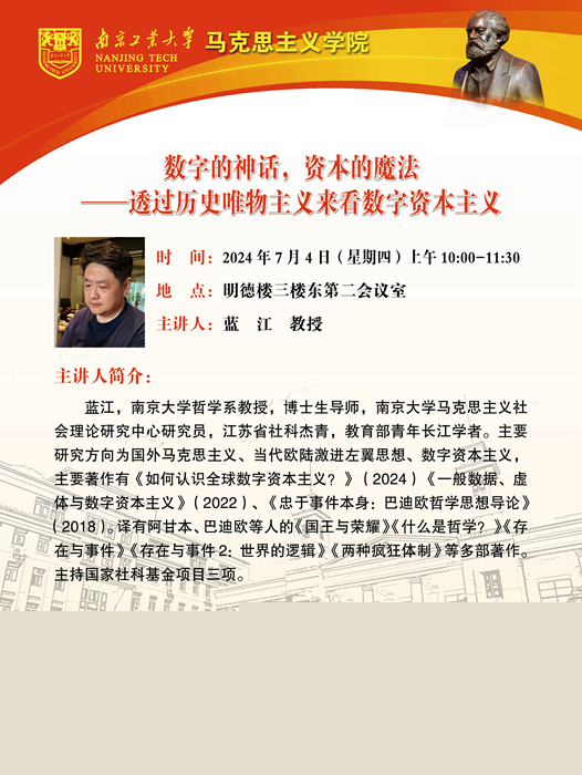 報告人簡介:藍江,南京大學哲學系教授,博士生導師,南京大學馬克思主義社會理論研究中心研究員,江蘇省社科杰青。主要研究方向為國外馬克思主義、當代歐陸激進左翼思想、數字資本主義,主要著作有《如何認識全球數字資本主義?》(2024)《一般數據、虛體與數字資本主義》(2022)、《忠于事件本身:巴迪歐哲學思想導論》(2018)。譯有阿甘本、巴迪歐等人的《國王與榮耀》《什么是哲學?》《存在與事件》《存在與事件2:世界的邏輯》《兩種瘋狂體制》等多部著作。主持國家社科基金項目三項。