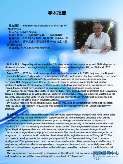 報(bào)告摘要:This presentation discusses the profound technological changes that have taken place around us during the last two decades, supported by the new disruptive advances both on the software and the hardware sides. In recent years, to change the whole format of industrial automation, these developments have been taken further, especially in Germany, under the label “Industry 4.0” that has recently evolved into “Industry 5.0.” Such engineered systems are named Cyber Physical Systems that are built from, and depends upon, the seamless integration of computational algorithms and physical components. The dominant feature of the changes is the integration of the virtual world with the physical world through the Internet of Things (IoT). The most recent development is the radical paradigm shift from “connected things'' to “connected intelligence.'' The presentation then concentrates on education. After presenting a brief history of engineering education, the recent paradigm changes are discussed, which essentially stress that skills must prevail over degrees to deal with challenges posed by the trends of the fifth industrial revolution.