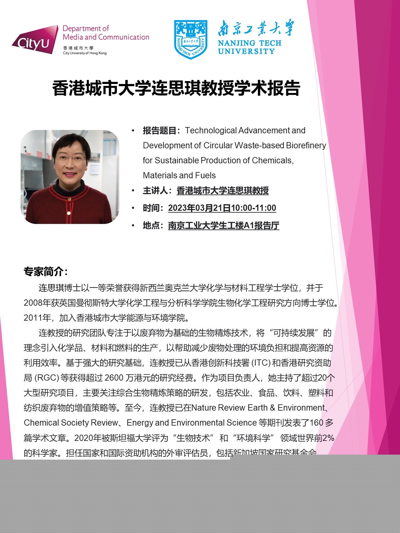 報告人簡介:連思琪博士以一等榮譽獲得新西蘭奧克蘭大學化學與材料工程學士學位,并于2008年獲英國曼徹斯特大學化學工程與分析科學學院生物化學工程研究方向博士學位。2011年,加入香港城市大學能源與環境學院。