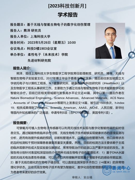 報告人簡介:熊澤,現任上海科技大學生物醫學工程學院常任助理教授、研究員、博導、無線與智能生物電子實驗室主任。2017年博士畢業于香港大學化學系,隨后前往新加坡國立大學依托電子與計算機工程系、N.1健康研究所、健康創新與科技研究所(iHealthtech)以及生物醫學工程系從事研究工作。主要致力于通過無線與智能生物電子技術賦能數字化和智能化診療。目前已在相關領域期刊發表高水平論文近40篇,其中以第一/通訊作者在Nature Biomedical Engineering,Science Advances,Advanced Materials,ACS Nano,Accounts of Chemical Research等期刊上發表論文14篇,被引近1500余次,h-index 19;相關成果得到了Reuters,Scientific American,AAAS,AIChE,人民日報,新華社等國內外知名媒體的廣泛報道;申請專利5項(含PCT專利2項,美國專利1項)。