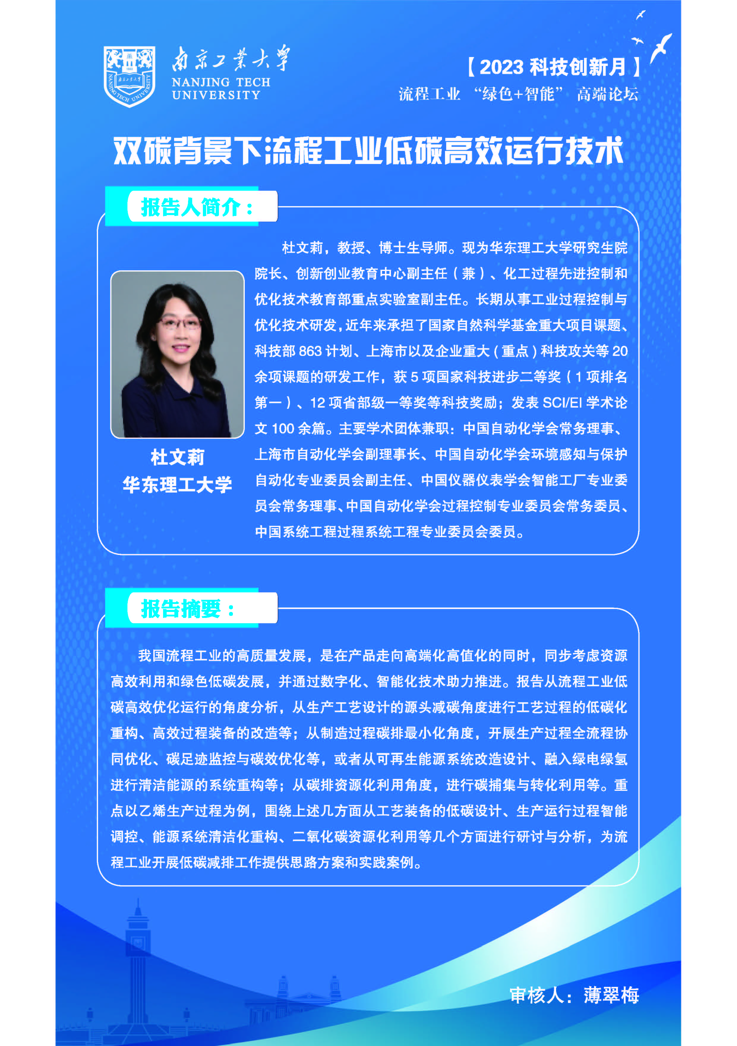 3 | 杜文莉 | 華東理工大學研究生院院長、創新創業教育中心副主任(兼)、化工過程先進控制和優化技術教育部重點實驗室副主任 | 雙碳背景下流程工業低碳高效運行技術 |