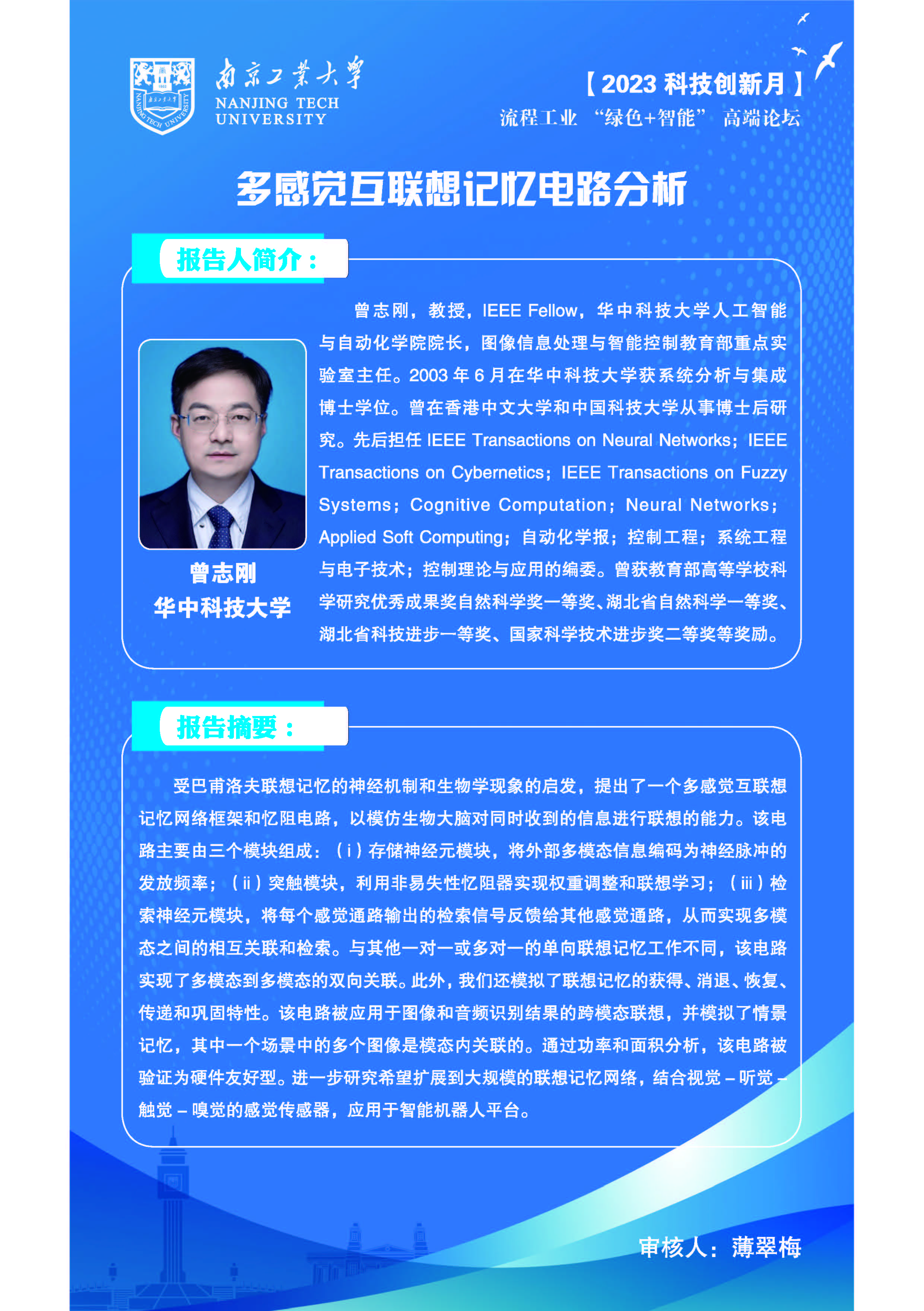 2 | 曾志剛 | IEEE Fellow,華中科技大學人工智能與自動化學院院長,圖像信息處理與智能控制教育部重點實驗室主任 | 多感覺互聯想記憶電路分析 |