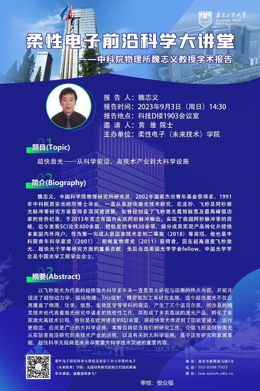 報告人簡介:魏志義,中國科學院物理研究所研究員,2002年國家杰出青年基金獲得者。1991 年中科院西安光機所博士畢業,一直從事超快激光技術研究,在皮秒、飛秒及阿秒激光脈沖等研究方面取得多項突破進展,如曾經創造了飛秒激光最短脈寬及最高峰值功率的世界紀錄,于2013年首次在國內實現阿秒脈沖輸出,實現了我國阿秒脈沖零的突破,迄今發表SCI論文400余篇,授權發明專利30余項,部分成果實現產品轉化并提供多家國內外用戶。作為第一完成人獲國家技術發明二等獎(2018)等獎項。他也是中科院青年科學家獎(2001)、胡剛復物理獎(2011)獲得者。因在超高強度飛秒激光、超快光子學等研究方面的重要貢獻,先后當選美國光學學會fellow、中國光學學會及中國光學工程學會會士。