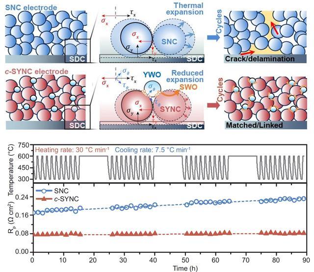 最終,研究團隊所獲得的復合電極材料顯示出良好的電化學性能和出色的熱機械穩定性。具體而言,在600 ℃下,復合電極具有良好的催化活性;在經歷40次熱循環后,性能僅下降了8%。