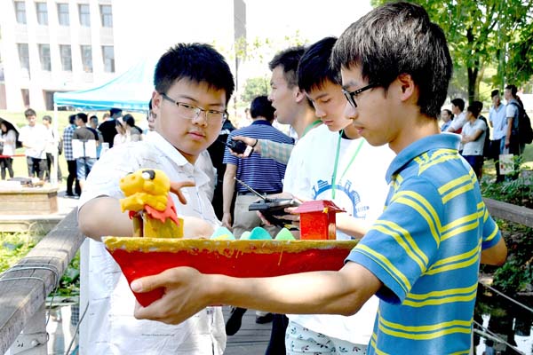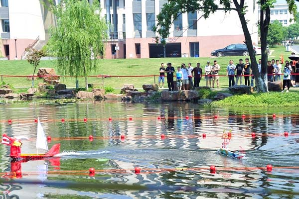 “龍行天下”“惟我獨尊”“舍我其誰”……只見一尾尾用或明黃或朱紅裝裱得精美的龍舟在南工君子湖用浮標所規劃出的航道上,劈波斬浪,湖里的小船沖鋒向前,岸上的主人緊張有序地遙控著小船直行、左轉、右拐、后退。