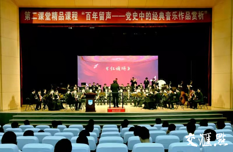 “這門課程以一種特別新穎的方式向我們講述黨的光輝歷史,讓我們在動人旋律中感受100年間,在黨的帶領下中國發生的滄桑巨變,體悟中國共產黨日益凸顯的戰斗力、凝聚力、創造力,特別具有吸引力。”選課學生代表、經濟與管理學院國貿1801學生金鑫自信地站上舞臺分享自己的感悟,“非常感謝學校、老師和交響管樂團的同學們,為我們帶來了一場別開生面的思政課、一場意義深遠的視聽盛宴。”
