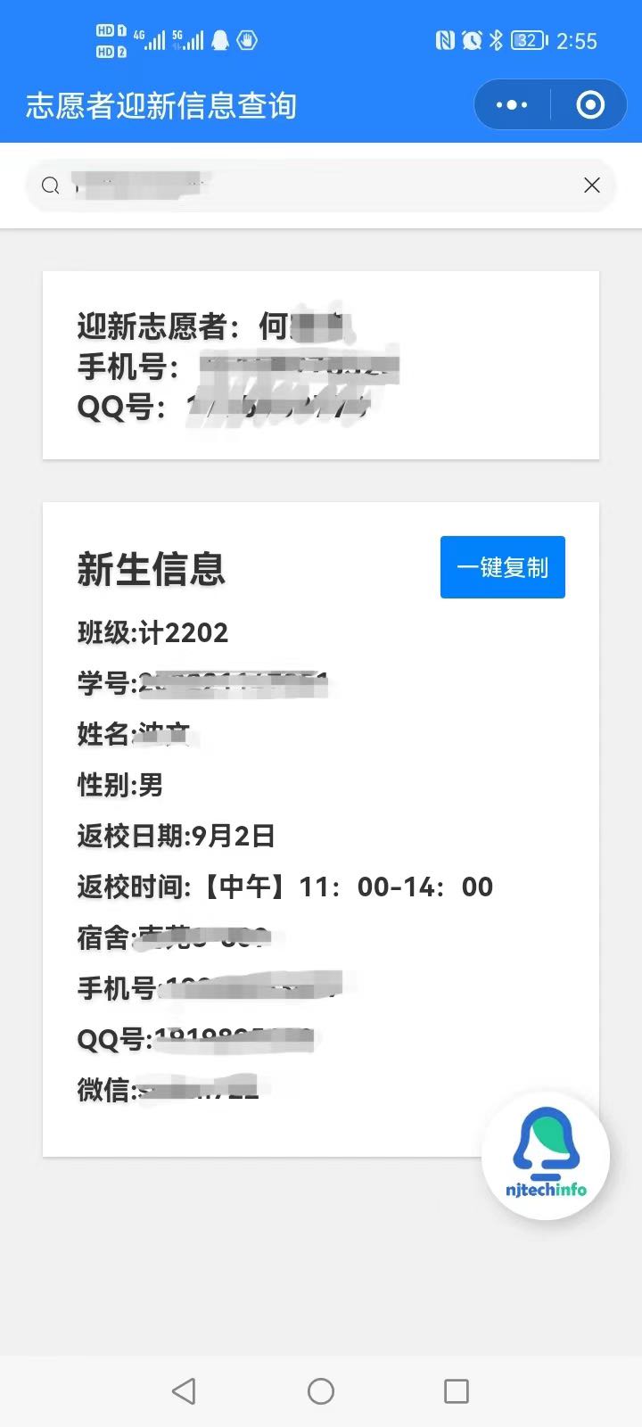 新生害怕是詐騙號碼不敢接、看錯了表格中的信息找錯了對接學長、共用一張匯總表帶來了新生信息的泄漏……在往年的迎新生工作中,南工大計算機學院的師生們常常會遇到這些“麻煩”,今年,他們想著能不能讓一對一服務更加便利、高效些。“結合計算機專業的優勢,我們就開發了一款志愿服務小程序——南工search。” 新生報到前10天,該校計算機學院計1907班靳修同學便馬不停蹄地投入到小程序的開發中,兩天不到,這款“一鍵直達”的一對一服務軟件就上線了,“志愿者輸入自己的信息即可查到服務新生的信息,新生輸入自己的信息即可查詢到志愿者的信息,參與了四年迎新,今年我終于發揮了專業優勢,幫了大家一把。”
