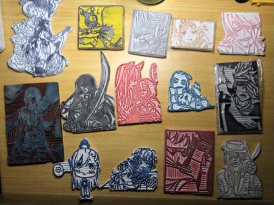 學會雕刻橡皮章后,劉玲利的興趣愛好不知不覺中更廣泛了,她開始尋求新的玩法,套印、熱縮片、滴膠等都成了她的摯愛。“用熱縮片凹造型,做成飾品,然后作為禮物送人,從而達到眾樂樂,挺好。”她說。熱縮片的原料是一種塑料紙,將刻好的橡皮章圖案印上去后,立即用吹風機或者熱風槍對著吹,就會使其急速收縮卷邊,壓平實冷卻后就成了原來三分之一大小的小塑料片,打上孔便可以做成小掛件。“縮小后的圖案比原來印出的圖案更加精致。這是橡皮章的衍生玩法,我算是‘愛屋及烏’吧。” 因為,總是刻卡通人物,大學時,她還參加了動漫社。“cosplay的造型或多或少融入了多年雕刻作業形象。”
