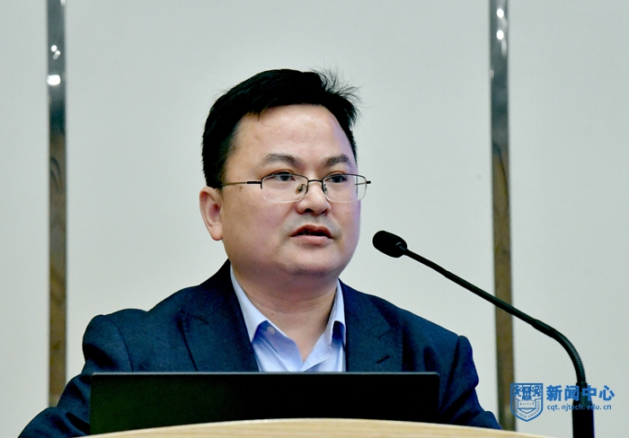 江蘇省政府研究室副主任沈和、江蘇省社科聯研究室主任、智庫研究與交流中心主任劉西忠受邀作專題報告,深刻闡述了“十四五”期間經濟社會發展對高校社科研究和智庫建設提出的新要求、新使命,為我校哲學社科事業發展擘畫了坐標、指明了方向。南京信息工程大學張慧明教授分享了理工科高校建設人文社科交叉研究型智庫的路徑,為我校智庫建設提供了可資借鑒的建議。社會科學處處長、科學研究院副院長陳紅喜報告了我校社科研究和基地智庫的建設現狀與發展方向。