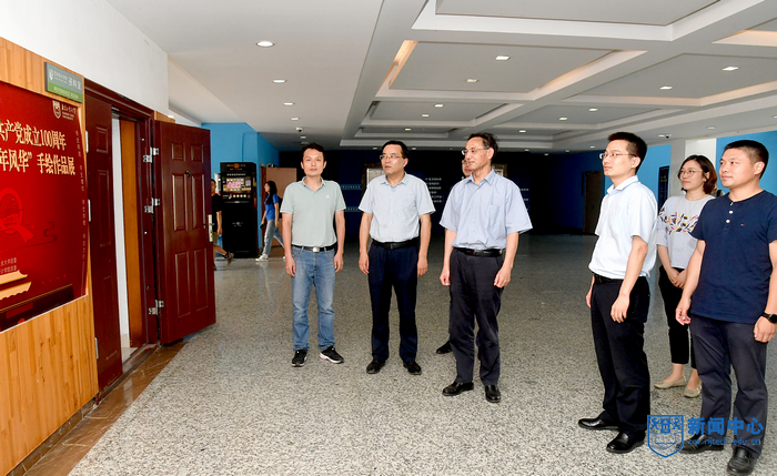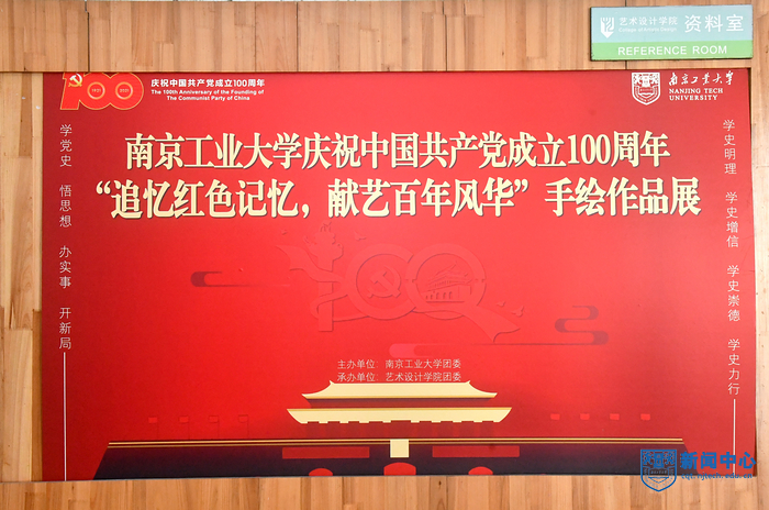 6月28日下午,南京工業大學慶祝中國共產黨成立100周年藝術作品展在博學樓一樓西側開展。校黨委副書記吳勝紅,黨委常委、宣傳部部長張健,校團委、藝術設計學院、法政學院負責人和師生代表一同觀看展覽。