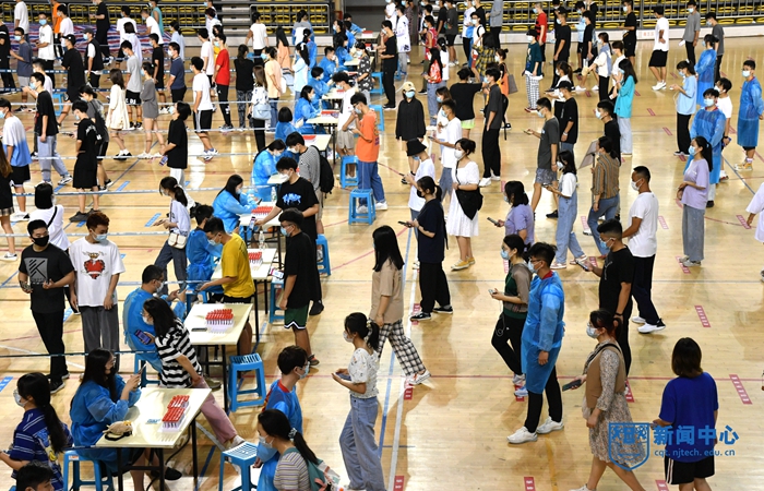 在各檢測(cè)點(diǎn),學(xué)校嚴(yán)格按照防疫要求劃分出核酸檢測(cè)等候區(qū)、登記區(qū)、采樣區(qū)、緩沖區(qū)、清潔區(qū)和生活物資供應(yīng)區(qū)、臨時(shí)隔離區(qū)、污物處置區(qū)等區(qū)域,檢測(cè)現(xiàn)場(chǎng)設(shè)置了20個(gè)采樣臺(tái)同步進(jìn)行。在輔導(dǎo)員引導(dǎo)下,學(xué)生分批次、分時(shí)段到達(dá)檢測(cè)地點(diǎn),每10人一組,依次測(cè)溫、掃碼、登記、采樣,以每小時(shí)4000余人的檢測(cè)速度,迅速推進(jìn)。檢測(cè)結(jié)束的學(xué)生在志愿者指引下有序離場(chǎng),不扎堆、不聚集,做到了“應(yīng)檢盡檢、不落一人”。