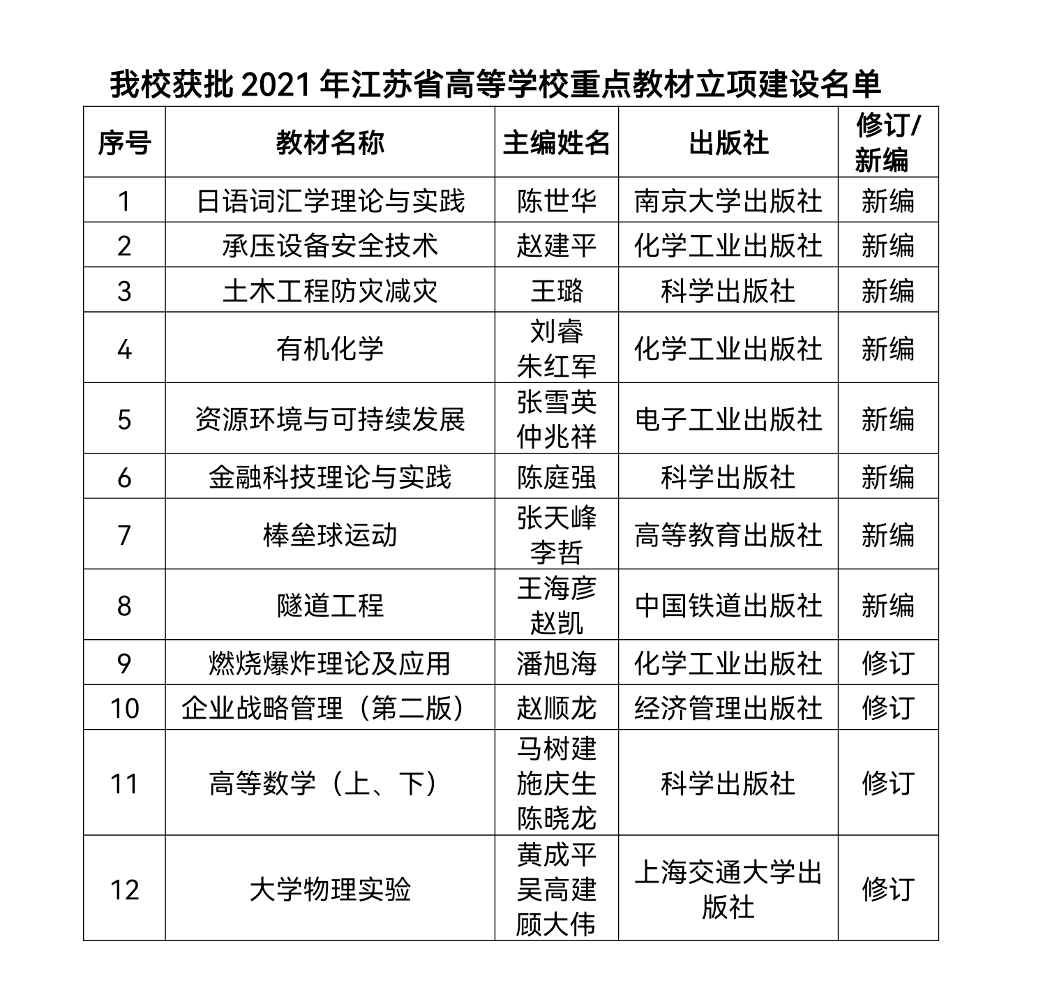 11月1日,江蘇省高等教育學會公布了2021年高等學校重點教材立項建設名單(蘇高教會〔2021〕39號),我校12本教材名列其中,標志著我校教材建設工作取得又一重大進展。