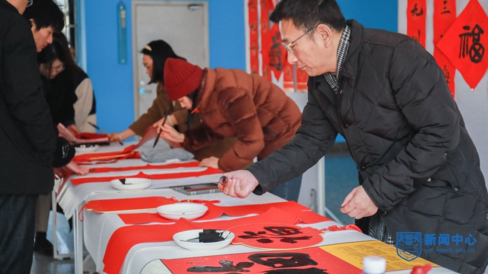 “筆墨濃情傳祝福”送春聯活動在《春節序曲》中拉開序幕。黨委宣傳部楊芳,離退休工作處蔣留兆,檔案館錢婷,馬克思主義學院陶然,藝術設計學院王志強、付強、馮梓月,交通運輸工程學院袁國林,外國語言文學學院江嬌等現場揮毫,根據在場師生喜好定制專屬春聯。“天增歲月人增壽,春滿乾坤福滿門”寄托了師生間真摯的新年祝福;“虎嘯風生遠,龍騰海浪高”表達了師生對虎年更進一步的殷切期盼。活動現場來往寫春聯、請春聯師生絡繹不絕,墨香四溢,喜氣洋洋。