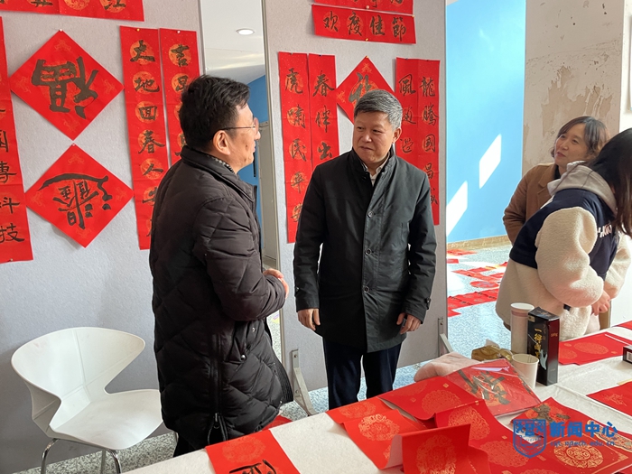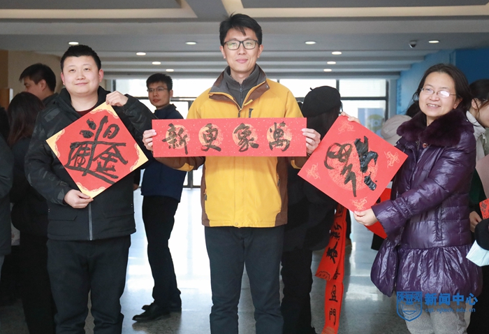 為深入學習貫徹黨的十九屆六中全會精神,弘揚中華優秀傳統文化,以美育人,以文化人,1月12日,校工會、藝術設計學院于博學樓一樓聯合舉辦“翰墨飄香寫福字,迎春送福暖人心”2022迎春送福活動。校黨委書記芮鴻巖,黨委常委、黨委宣傳部部長張健蒞臨現場,各職能部門、學院師生代表齊聚一堂,共同創作、欣賞新年書法祝福作品。