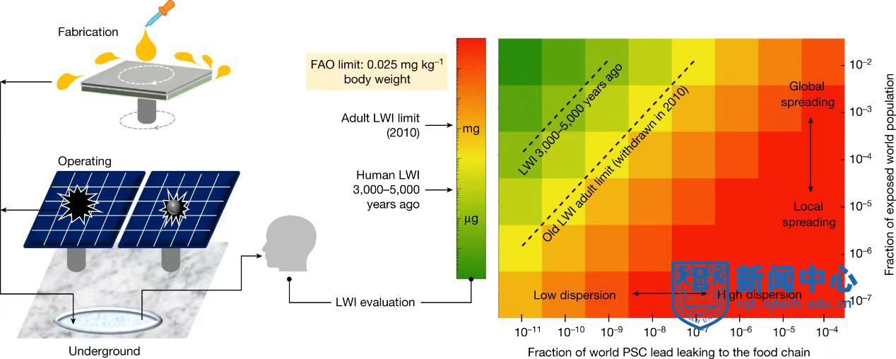 鉛基鈣鈦礦太陽電池在新能源領域展現出極大的應用潛力,而鉛元素潛在的環境危害性將成為其產業發展的瓶頸。雖然鈣鈦礦光伏組件中鉛元素的重量占比較低,但由于鉛離子較高的生物兼容性,組件中極小比例的鉛進入食物鏈即可超出聯合國糧農組織設定的人均每周鉛攝入量上限,從而危及人類健康(圖1)。