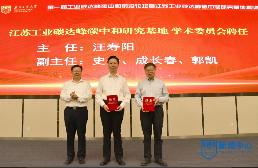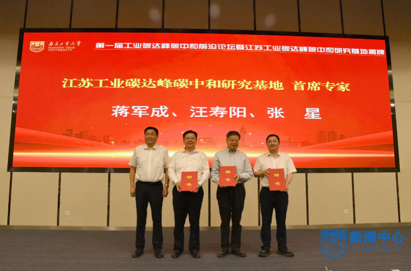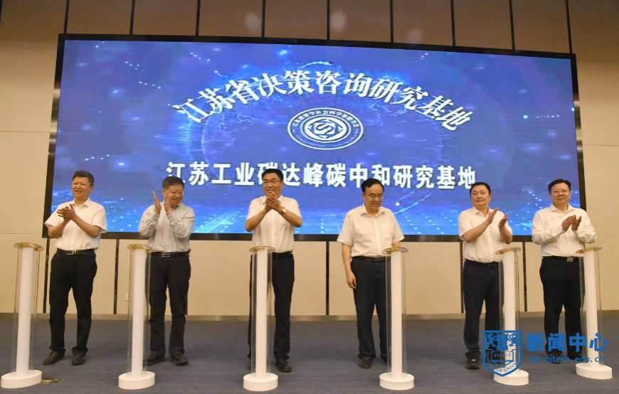 劉西忠副主席宣讀了江蘇工業(yè)碳達峰碳中和研究基地認定文件。張來斌院士、汪壽陽院士、張新科書記、芮鴻巖書記、蔣軍成校長、張星副廳長為基地揭牌。張新科書記為基地首席專家蔣軍成、汪壽陽、張星頒發(fā)聘書。黨委副書記吳勝紅宣讀了基地理事會、學(xué)術(shù)委員會及研究機構(gòu)的組成。蔣軍成校長分別為兼職教授、學(xué)術(shù)委員會委員頒發(fā)聘書并佩戴校徽。