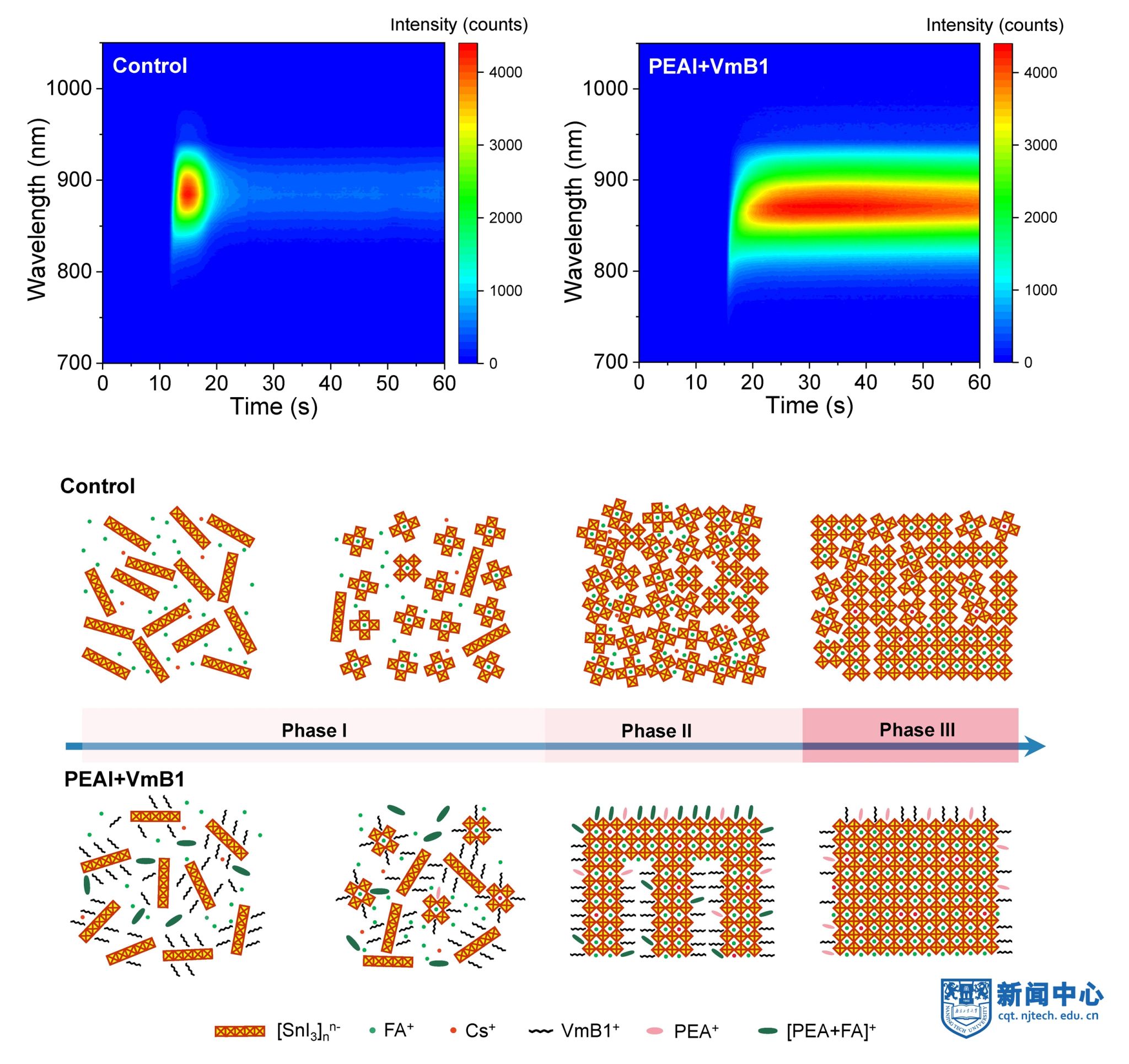 為此,黃維院士、王建浦教授、王娜娜教授、常進副教授團隊利用原位光譜表征技術,揭示了錫基鈣鈦礦薄膜生長初期(10秒內)晶粒的快速聚集是缺陷態形成的主要原因。進而發現,通過在鈣鈦礦前驅體溶液中引入與碘化亞錫有強化學作用的一類添加劑(以維生素B1為代表),可以有效抑制鈣鈦礦晶粒的快速聚集,減少鈣鈦礦晶體生長過程中發光猝滅中心的形成。該研究團隊在基于這一方法構筑的錫基鈣鈦礦薄膜上制備的LED器件外量子效率達到8.3%,是目前錫基鈣鈦礦LED的最高效率。這項工作為實現更高性能的錫基鈣鈦礦光電器件提供了全新的思路和途徑,有望在近期取得重大突破。